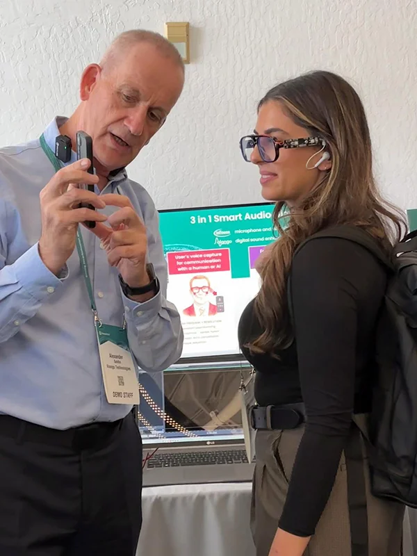 | Smart glasses are no longer just a futuristic concept — they’re becoming a reality, and Alango Technologies is helping lead the way. At Infineon OktoberTech Silicon Valley 2025, our founder and CEO Dr. Alexander Goldin unveiled Alango’s latest smart audio glasses reference design, built to redefine voice interaction in wearable tech. Featuring eight Infineon low-noise MEMS microphones and an IVS bone-conducted voice sensor, our glasses deliver intelligent audio performance across three dynamic modes: hearing enhancement to improve face-to-face communication in noisy settings, crystal-clear voice pickup for calls and voice control, and far-field voice capture for live translation and transcription. Despite the high ambient noise on the show floor, all modes performed flawlessly. Our team presented non-stop for eight hours and received enthusiastic interest and follow-ups from attendees. If you are developing smart glasses with advanced voice and audio capabilities, contact Alango Technologies to explore what’s (im)possible — including how we can help you achieve remarkable loudspeaker sound quality in compact wearable designs. You can find video highlights from the Internal Infineon Demo-Day and Infineon OktoberTech 2025 on our YouTube channel. |